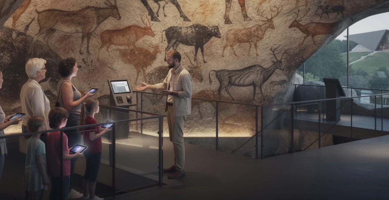 Après la grotte, le parcours se prolonge par des espaces d’interprétation très numériques. Chaque visiteur reçoit une tablette tactile synchronisée, qui sert d’audioguide enrichi. Elle permet de zoomer sur les panneaux, d’afficher des détails invisibles à l’œil nu, de visualiser en 3D certaines sections de la grotte, voire de superposer des interprétations en réalité augmentée. Des bornes interactives proposent des séquences sur les pigments, les techniques de gravure ou la datation par le carbone 14.