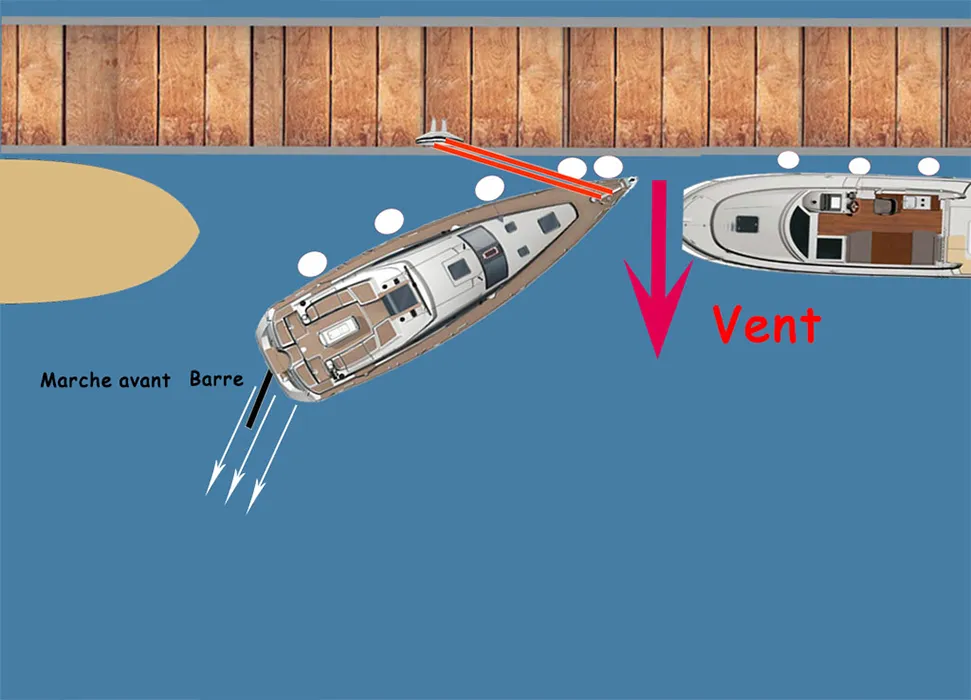 Cette technique demande un peu de pratique, mais elle devient vite intuitive : plus le vent est fort, plus vous devez présenter d’angle au départ, puis le réduire progressivement à mesure que vous vous rapprochez du quai. Gardez toujours une marge de sécurité suffisante pour casser l’erre en marche arrière si la dérive devient trop forte. Un propulseur d’étrave facilite grandement la manœuvre en crabe, mais elle reste tout à fait réalisable sans, en jouant avec l’angle de barre et de brèves impulsions moteur.