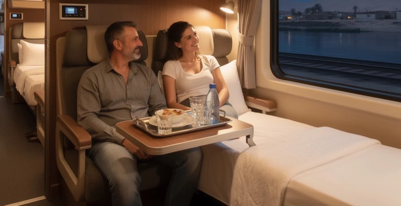 L’un des atouts du billet de train couchette Le Caire–Louxor est l’inclusion d’un dîner et d’un petit-déjeuner servis directement dans votre cabine. Peu après le départ, le personnel vient vous apporter un plateau-repas chaud, souvent au choix entre plusieurs options simples avec viande (souvent du poulet), un repas plus léger ou végétarien selon les disponibilités. Le plateau comprend en général un plat principal, du riz ou des pâtes, un petit pain, un dessert basique et parfois une petite salade.